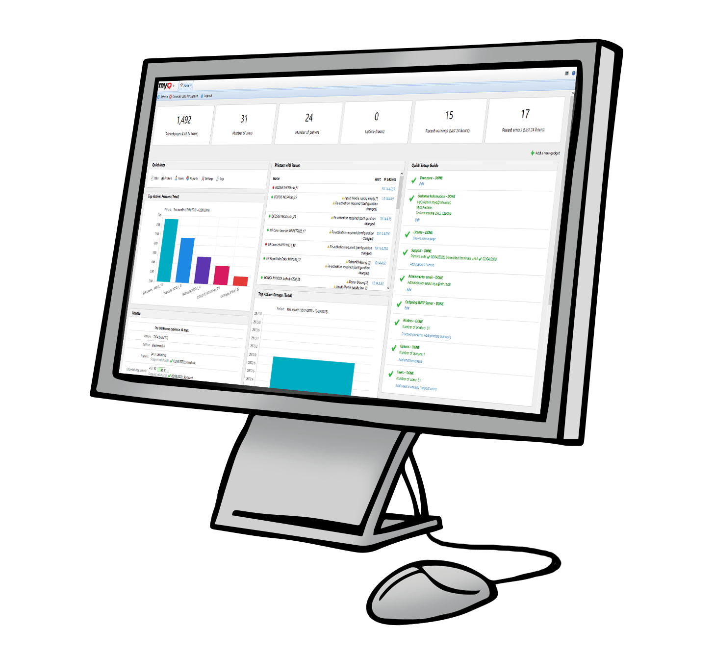 System administrators need an immediate and easy-to-understand view of what is happening in their MyQ environment, from the printer fleet status to user behavior and more. The MyQ Admin Dashboard allows them to set up and configure gadgets that show them exactly what they need to see.